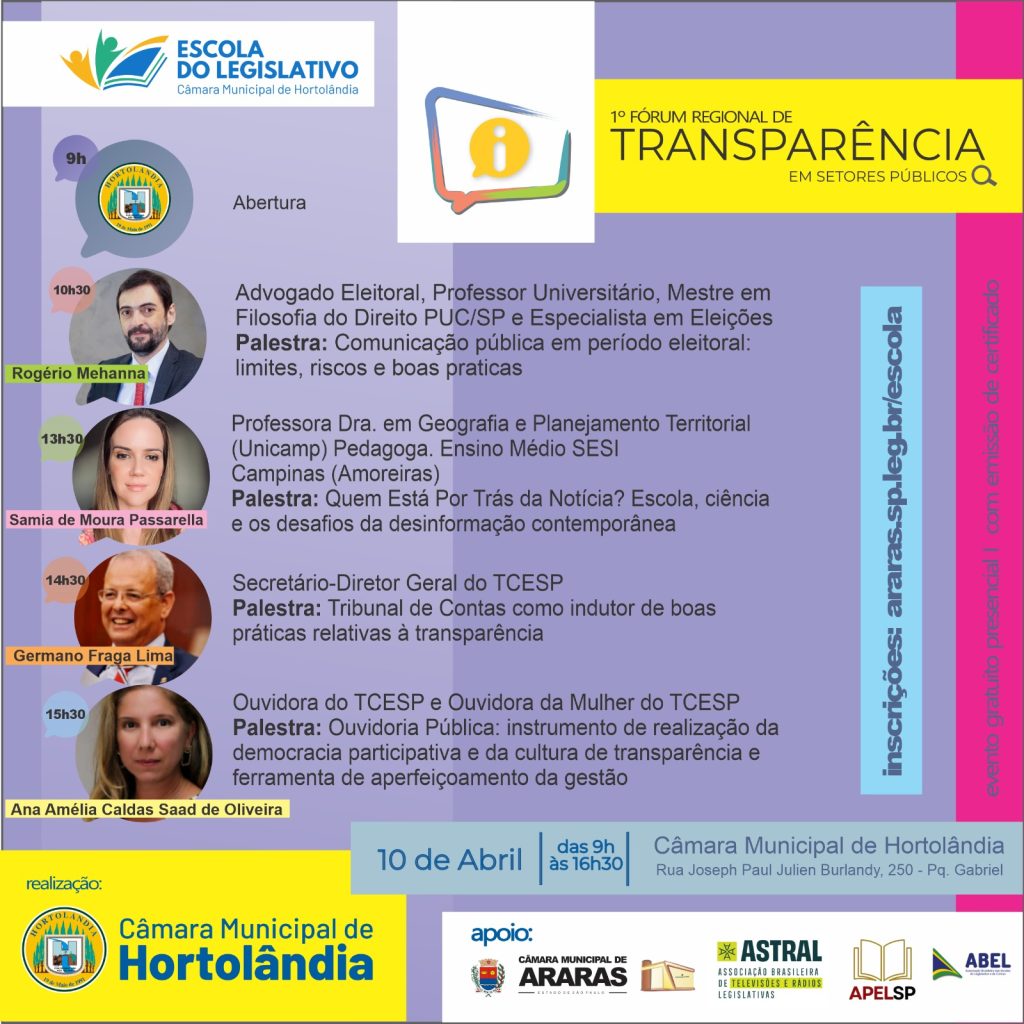 A Associação Brasileira das Escolas do Legislativo e de Contas (ABEL) está entre as instituições apoiadoras do 1º Fórum Regional de Transparência em Setores Públicos, promovido pela Escola do Legislativo da Câmara Municipal de Hortolândia. O evento será realizado no dia 10 de abril, das 9h às 16h30, na sede do Legislativo hortolandense.