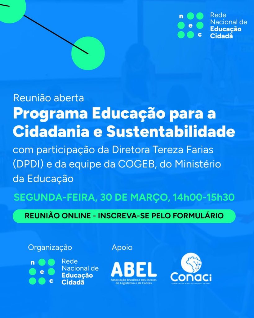 A Associação Brasileira das Escolas do Legislativo e de Contas (ABEL) manifesta apoio à reunião promovida pela Rede Nacional de Educação Cidadã (Redenec), que será realizada no dia 30 de março, em formato online, com representantes do Ministério da Educação (MEC). O encontro tem como objetivo discutir a implementação do Programa Educação para a Cidadania e Sustentabilidade, iniciativa voltada ao fortalecimento da formação cidadã no país.