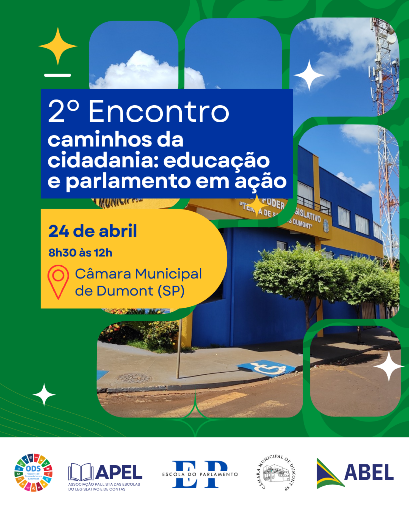 Estão abertas as inscrições para o 2º Encontro Caminhos da Cidadania: educação e parlamento em ação, promovido pela Associação Brasileira das Escolas do Legislativo e de Contas (ABEL) e pela Escola do Parlamento da Câmara Municipal de Dumont, com apoio da Associação Paulista das Escolas do Legislativo e de Contas (APEL). O evento ocorre no dia 24 de abril, das 8h30 às 12h, na Câmara Municipal de Dumont, com 100 vagas disponíveis. Clique aqui para se inscrever.