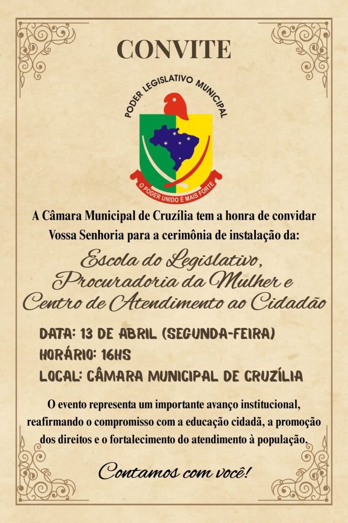 Minas Gerais (MG) passará a contar com mais uma Escola do Legislativo. A Câmara Municipal de Cruzília realizará, no dia 13 de abril, às 16h, a cerimônia de instalação da nova estrutura, em iniciativa que reforça o avanço da educação legislativa no estado e amplia as ações de formação cidadã no âmbito do Poder Legislativo municipal.